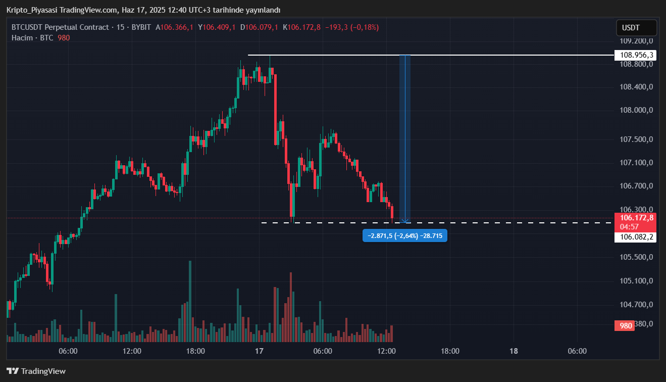 Bu son gelişmeler neticesinde lider kripto para birimi Bitcoin (BTC) tekrardan 106 bin dolar seviyelerine kadar düşüş yaşadı. BTC bu düşüş sonrasında 107.700 dolara kadar toparlansa da, an itibariyle 106.300 dolardan işlem görüyor.